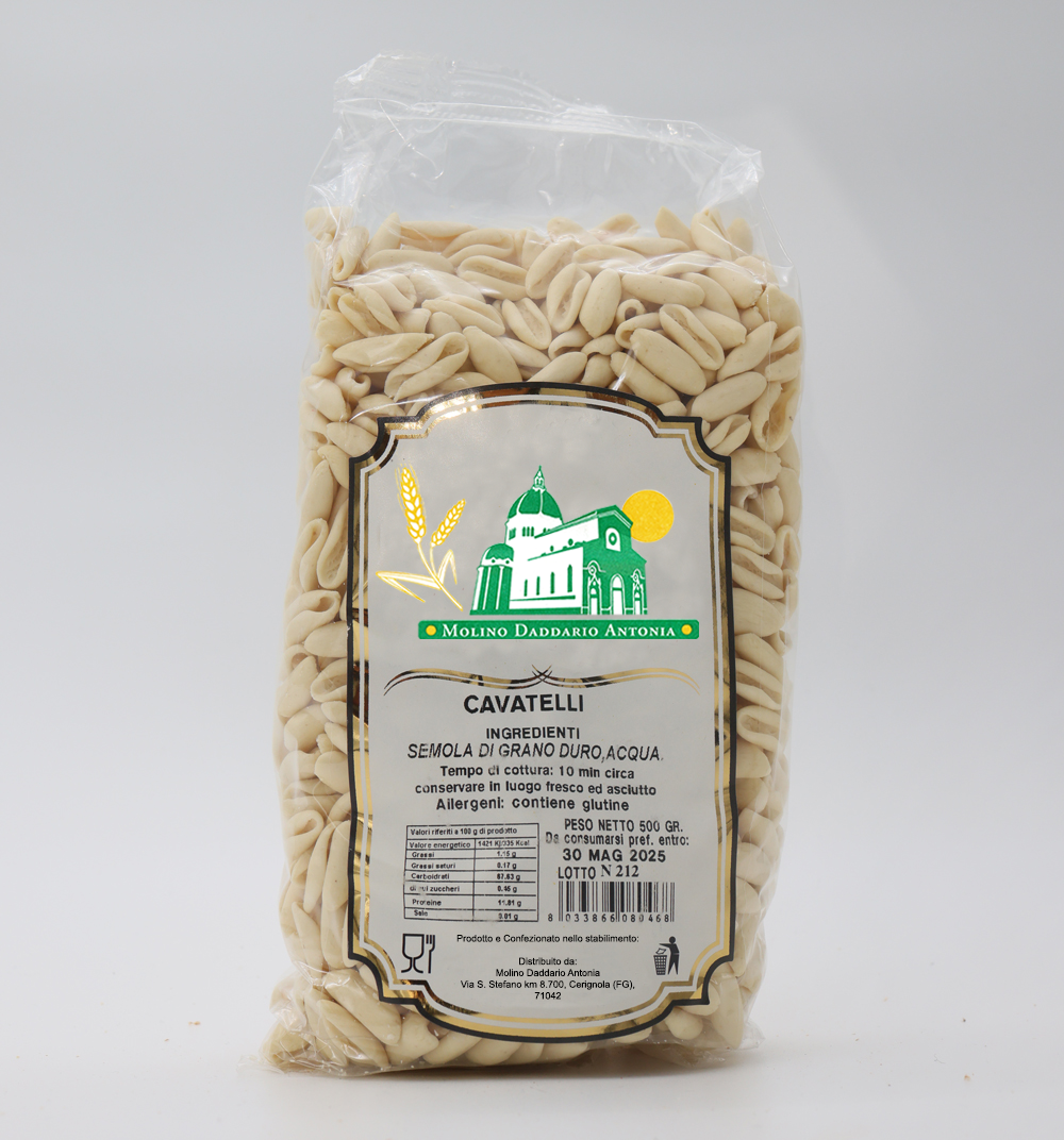 Questo pacchetto da 500 grammi contiene cavatelli di alta qualità, realizzati con ingredienti tipici pugliesi e prodotti artigianalmente presso uno stabilimento storico di Cerignola.