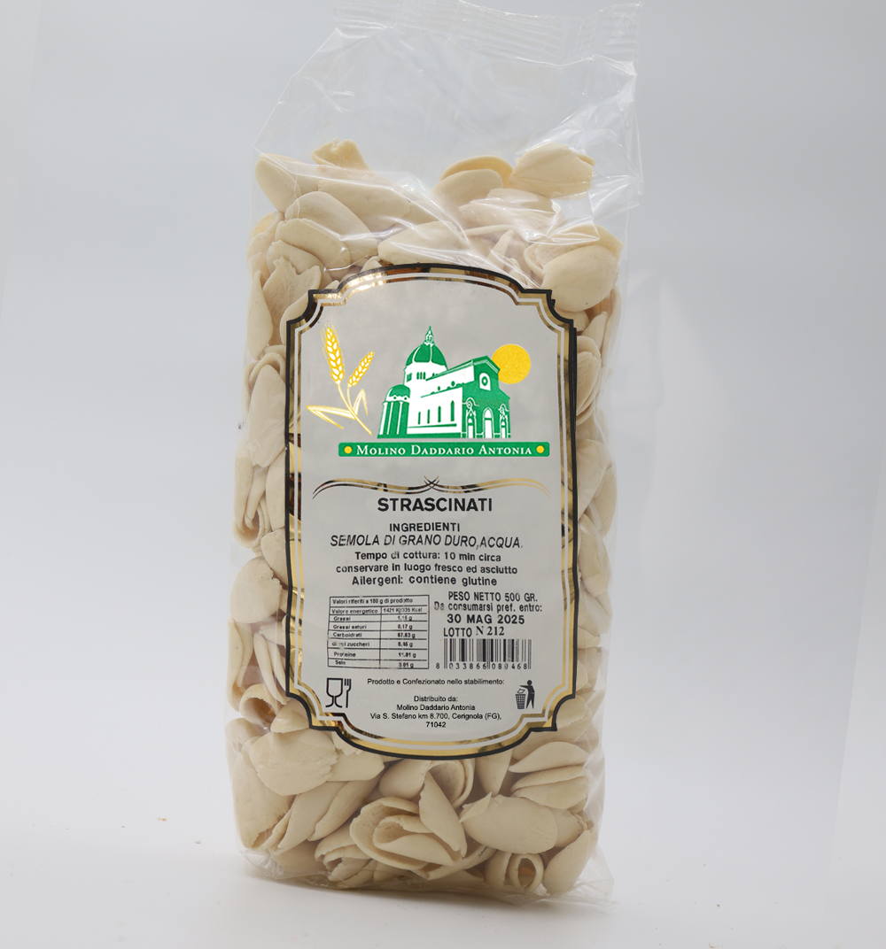Questo pacchetto da 500 grammi contiene strascinati di alta qualità, realizzati con ingredienti tipici pugliesi e prodotti artigianalmente presso uno stabilimento storico di Cerignola.