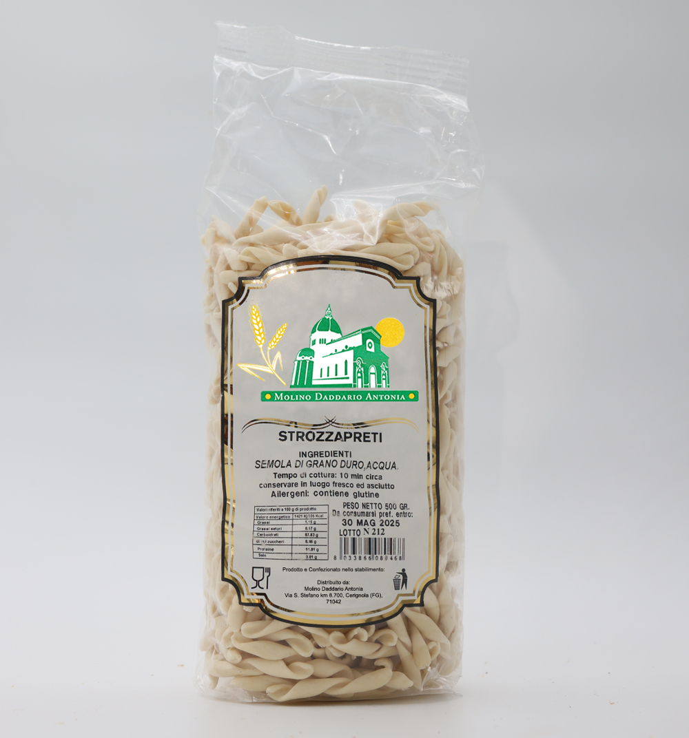 Questo pacchetto da 500 grammi contiene strozzapreti di alta qualità, realizzati con ingredienti tipici pugliesi e prodotti artigianalmente presso uno stabilimento storico di Cerignola.
