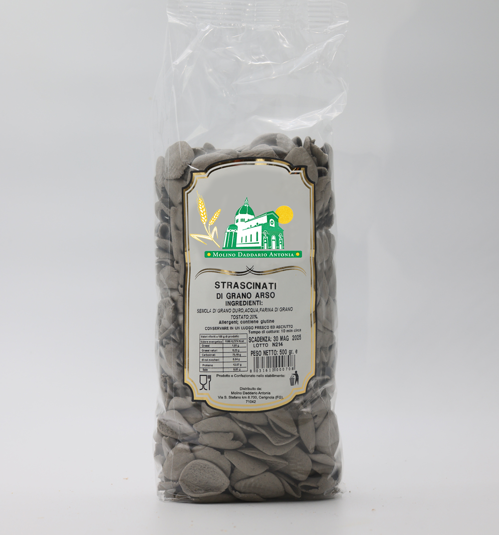 Questo pacchetto da 500 grammi contiene strascinati di alta qualità, realizzati con ingredienti tipici pugliesi, coma la farina di grano arso, prodotto tipico pugliese e core business della nostra attività. Le nostre paste sono prodotte artigianalmente presso uno stabilimento storico di Cerignola.