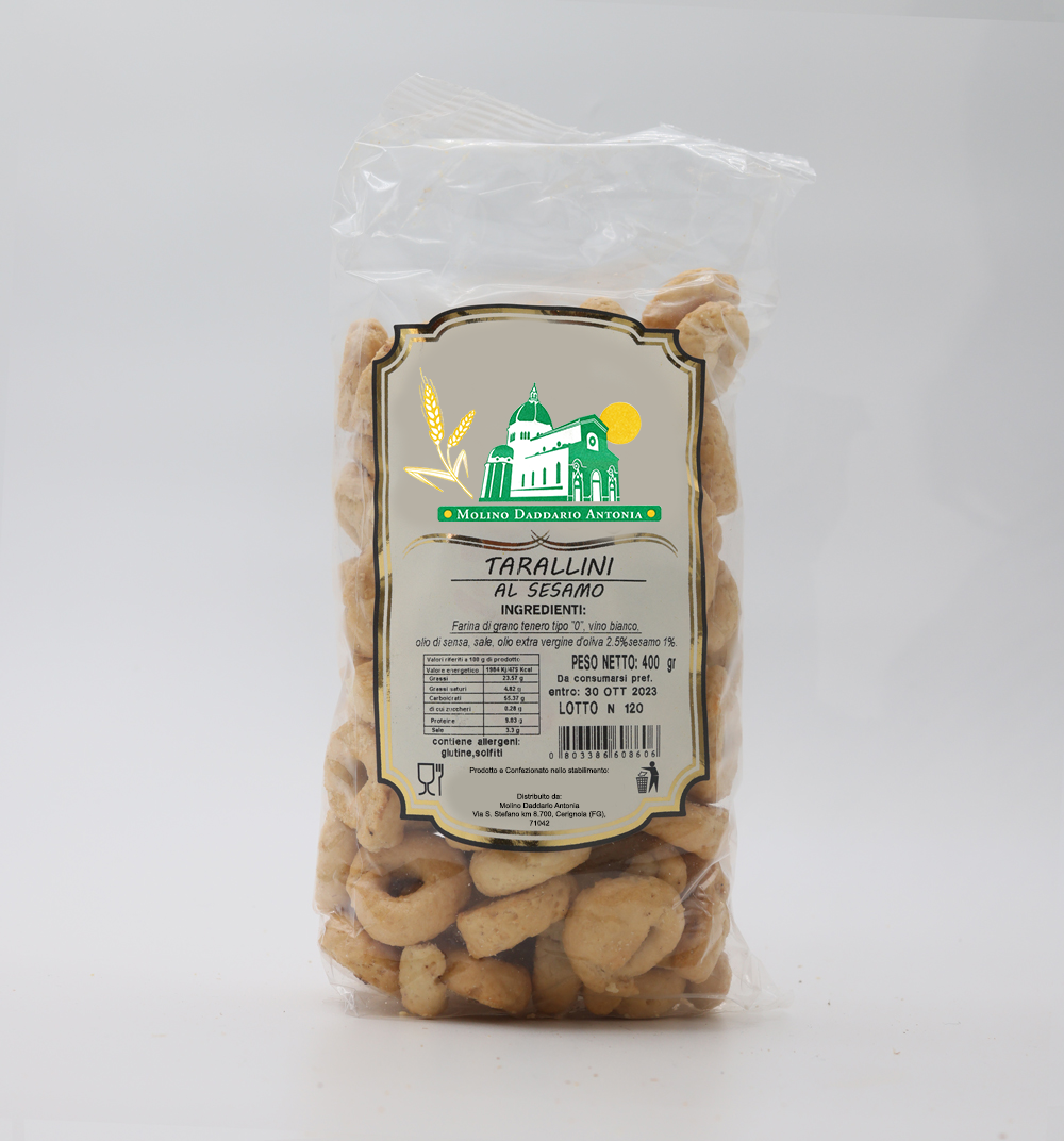 Assapora la tradizione pugliese con i nostri Tarallini Pugliesi al Sesamo - Molino Daddario Antonia disponibili in diversi gusti irresistibili.