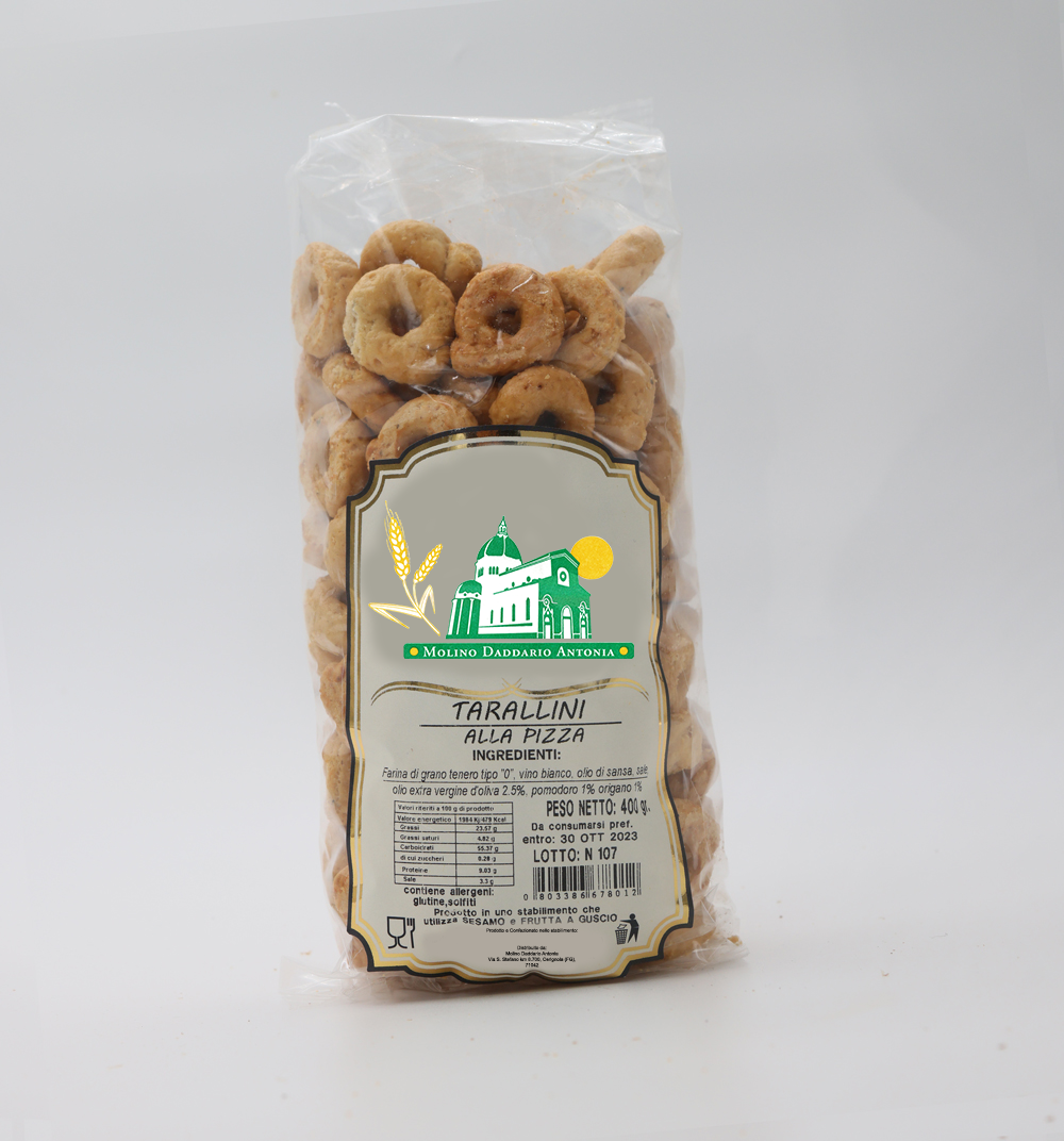 Assapora la tradizione pugliese con i nostri Tarallini Pugliesi alla Pizza - Molino Daddario Antonia disponibili in diversi gusti irresistibili.