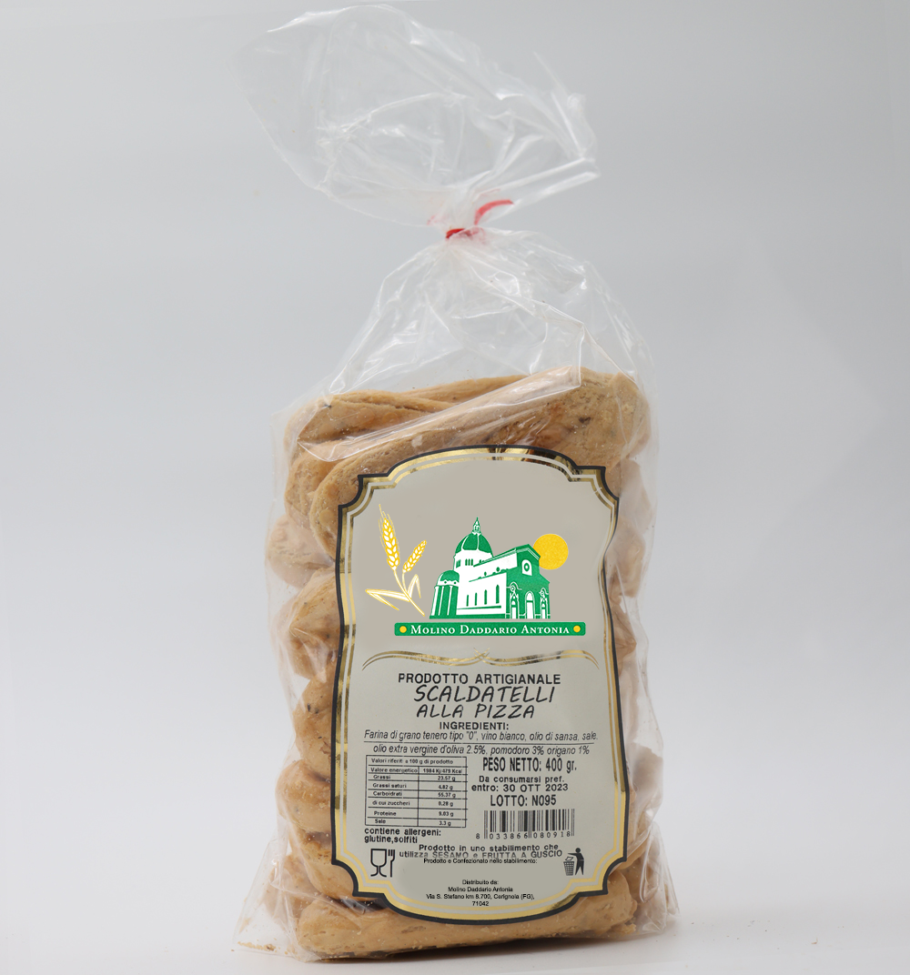 Assapora la tradizione pugliese con i nostri Scaldatelli Pugliesi alla Pizza - Molino Daddario Antonia disponibili in diversi gusti irresistibili.