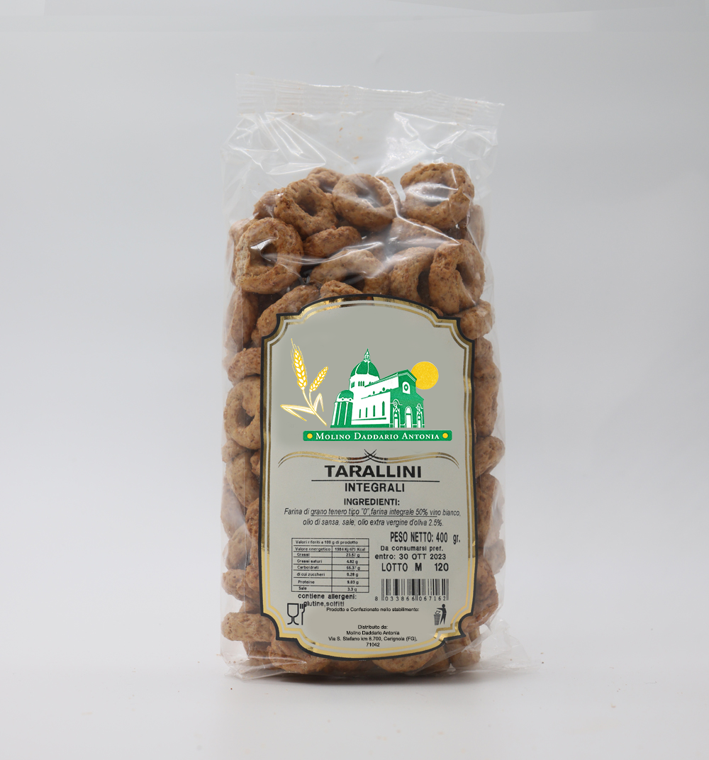 Assapora la tradizione pugliese con i nostri Tarallini Pugliesi Integrali - Molino Daddario Antonia disponibili in diversi gusti irresistibili.